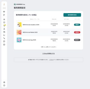 あらかじめ販売期間を登録している商品は、販売開始日時になると自動で購入が可能な状態になり、販売終了日時がくると自動で販売終了の表示に変わります。