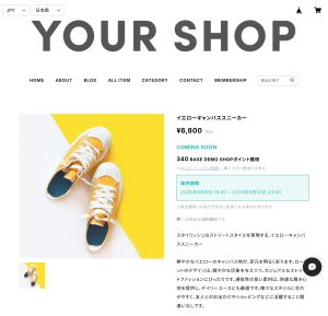 販売期間を設定した商品は、販売開始日時までの間、商品を告知状態(Coming Soon)で公開する事ができるので、ショップに来てくれたお客様に商品の販売時期を告知することができるようになります。