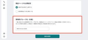 この項目は管理画面内のみで表示される名前になります。新商品のリリースやイベント商品の管理にご利用ください。(未入力の場合は選択した商品の一番最初の商品名と商品数が表示されます。)