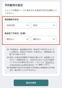 発送開始予定日と発送完了予定日を選択して、商品を販売する期間を設定します。発送完了予定日の設定は任意項目なので、発送開始予定日だけでも設定が可能です。