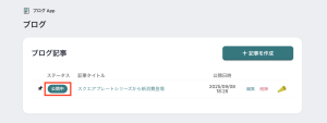 記事の公開が完了すると、自動的に画面が切り替わり、一覧ページに表示されます。ステータスが「公開中」になっていることを確認しましょう。