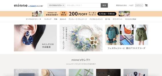 minneをはじめとする、ハンドメイド専門のマーケットプレイスで販売する方法です。知名度のあるサービスであれば、ハンドメイドを求める顧客が集まるため、集客しやすいのが魅力です。
