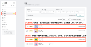 商品が売れると、「BASE」から登録したメールアドレスに商品の購入通知が届きます。そこで「BASE」の管理画面の「注文管理」という項目を開くと下のような画面になります。