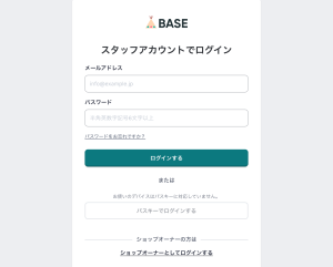 スタッフの方が、すでにショップオーナーのアカウントで「BASE Creator」にログインしている場合は、「BASE Creator」をログアウトし、Webブラウザからスタッフとしてログインしてご利用ください。