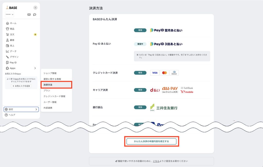 「BASEかんたん決済」を導入済みのショップ様は、とくに新しいお申し込みのお手続きは必要ありません。