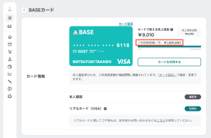 ご自身のBASEカードのご利用限度額は、BASEカードページの下記赤枠部分に表示されています。