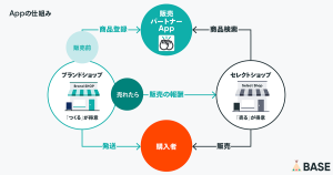 「販売パートナー App」は、商品の企画・製造が得意な「ブランドショップ」と商品の認知拡大・販売が得意な「セレクトショップ」を、BASE内でマッチングする機能です。