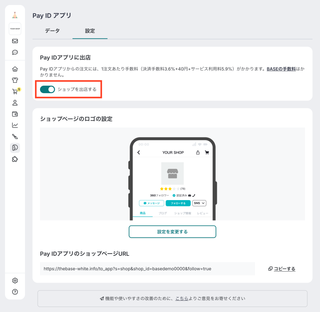BASEの管理画面にログインし、メニューから「Pay IDアプリ」を選択し、「設定」タブから「Pay IDアプリに出店」にチェックすることで、Pay IDにも商品を自動で出品できます。「Pay ID」の集客や売上アップ効果を活用するためにも、このチェックは忘れずに入れておきましょう。
