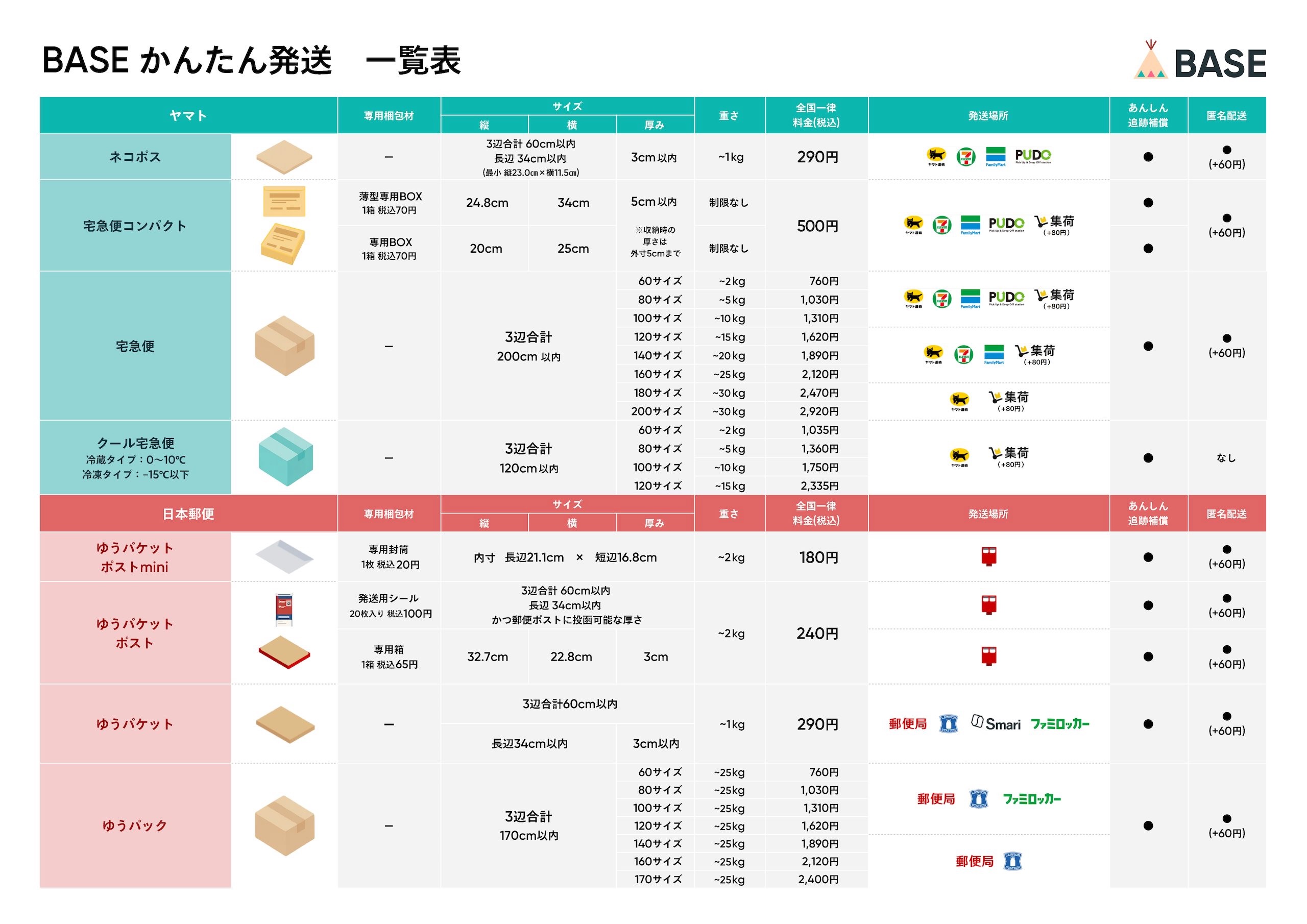 日本郵便・ヤマトをお安くかんたんに利用できる、ヤマト運輸と日本郵便が扱うBASE独自の配送サービスです。