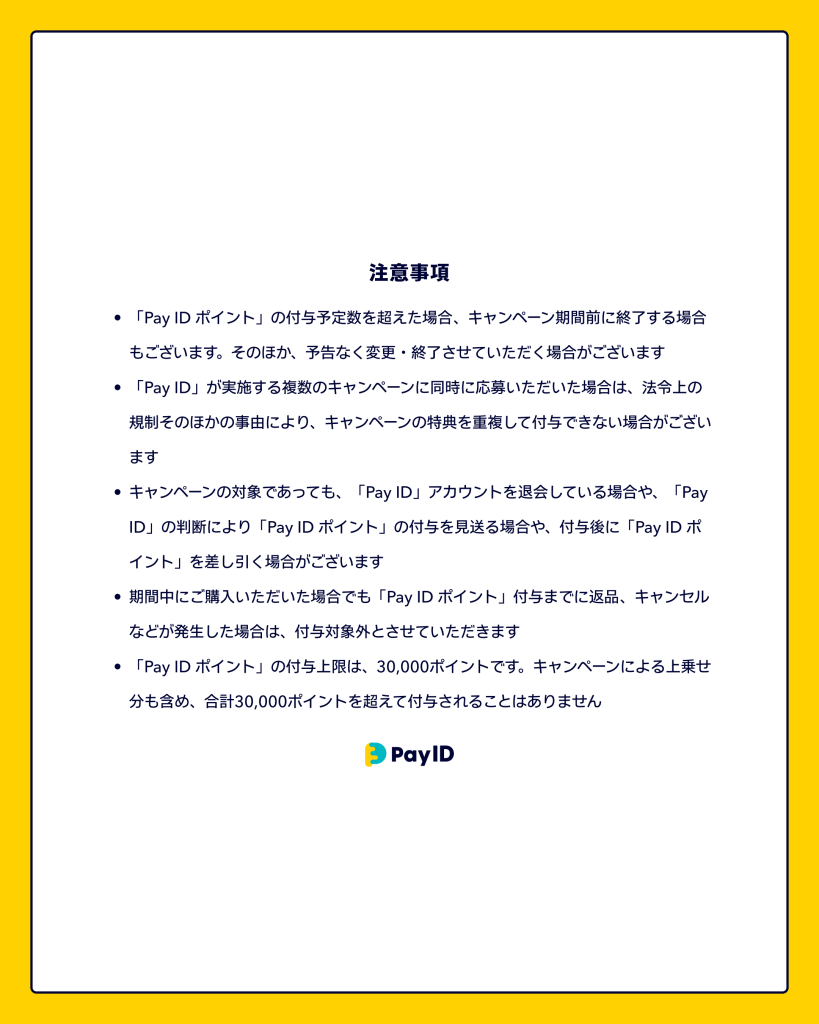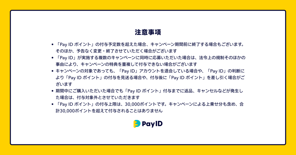 「Pay IDアプリ」から「Pay ID」でログインし、Pay IDクレジットカード決済とPay IDあと払い決済でお買いものすると、キャンペーンの対象となります。