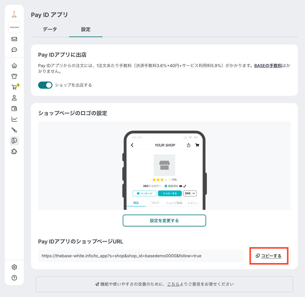 BASEの管理画面にログインし、「Pay IDアプリ」ページの設定タブから「ショップを出店する」をONにしてください。
