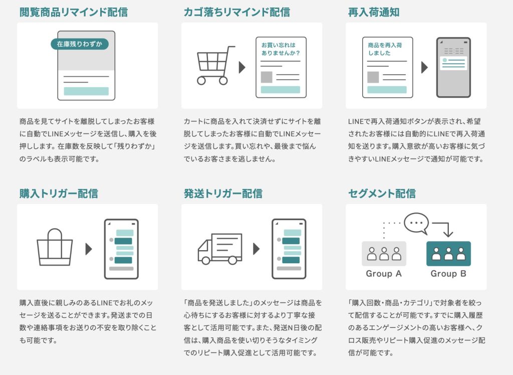 たとえば、「商品を閲覧したが購入していない」「カートに入れたまま離脱した」などの行動に合わせて、自動でメッセージを送信したり、購入履歴や興味・関心に応じた配信も可能です。