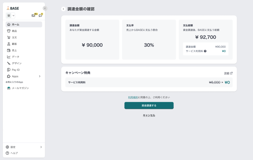 STEP4:資金調達完了後は、即時でBASEの売上残高にチャージされます。