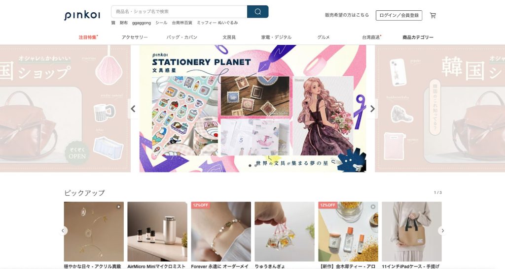 Pinkoiは、台湾発のデザイン特化型マーケットプレイスで、台湾・香港・中国・タイなどの地域を中心に展開しています。Etsyのアジア版とも呼ばれ、クリエイターの雑貨やファッション、インテリア、文房具などが人気。