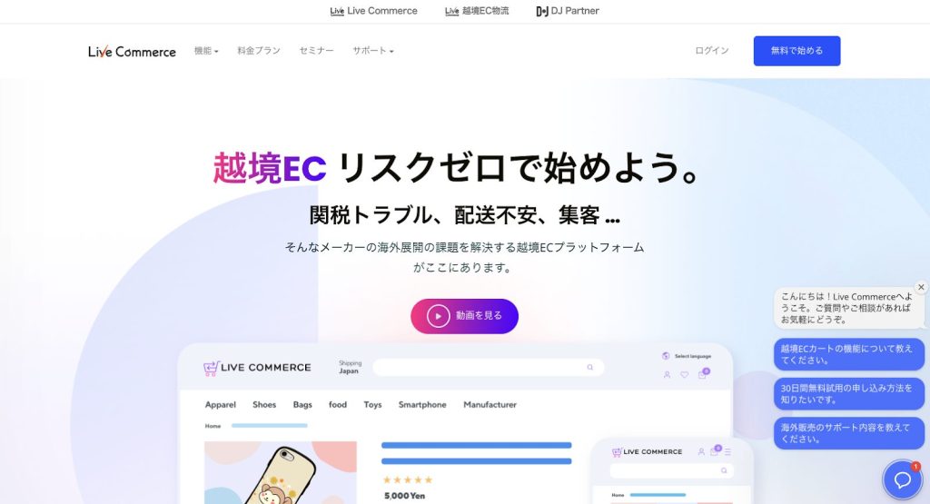 Live Commerceは日本国内企業が提供する越境EC専用のネットショップ作成サービスです。有料プランを基本としつつ、初期費用を抑えて始められる点が特徴です。