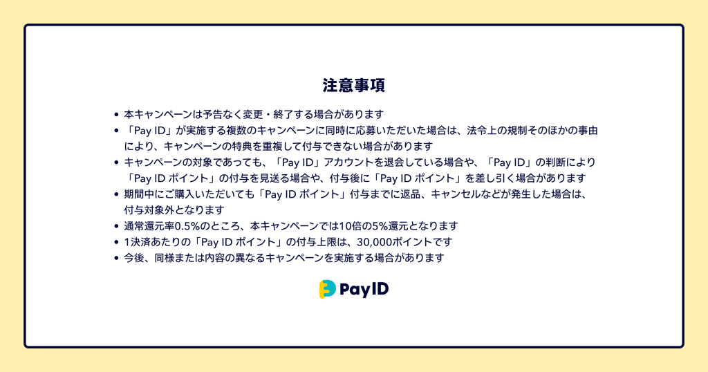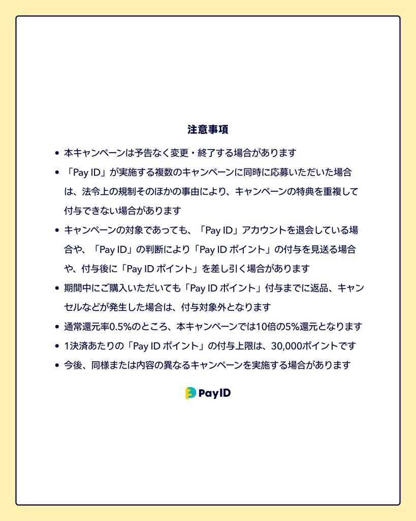 「Pay IDアプリ」から「Pay ID」でログインし、Pay IDクレジットカード決済とPay IDあと払い決済でお買いものすると、キャンペーンの対象となります。