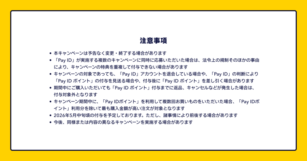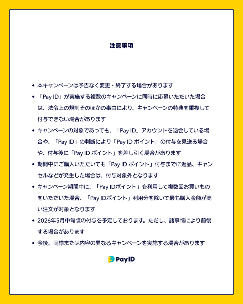 「Pay IDアプリ」から「Pay ID」でログインし、Pay IDクレジットカード決済とPay IDあと払い決済でお買いものすると、キャンペーンの対象となります。