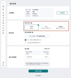通常の振込申請は、売上の振込申請から入金まで10営業日をいただいていますが、「お急ぎ振込」は入金までの期間を最短で翌営業日まで短縮できます。