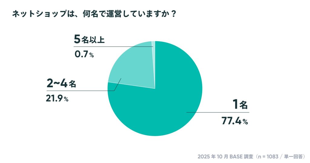 ネットショップの運営人数は、「1名」が77.4%ともっとも多く、次いで「2〜4名」が21.9%と、2019年調査開始時から変わらず、4名以下のショップが99.3%と9割超となりました。