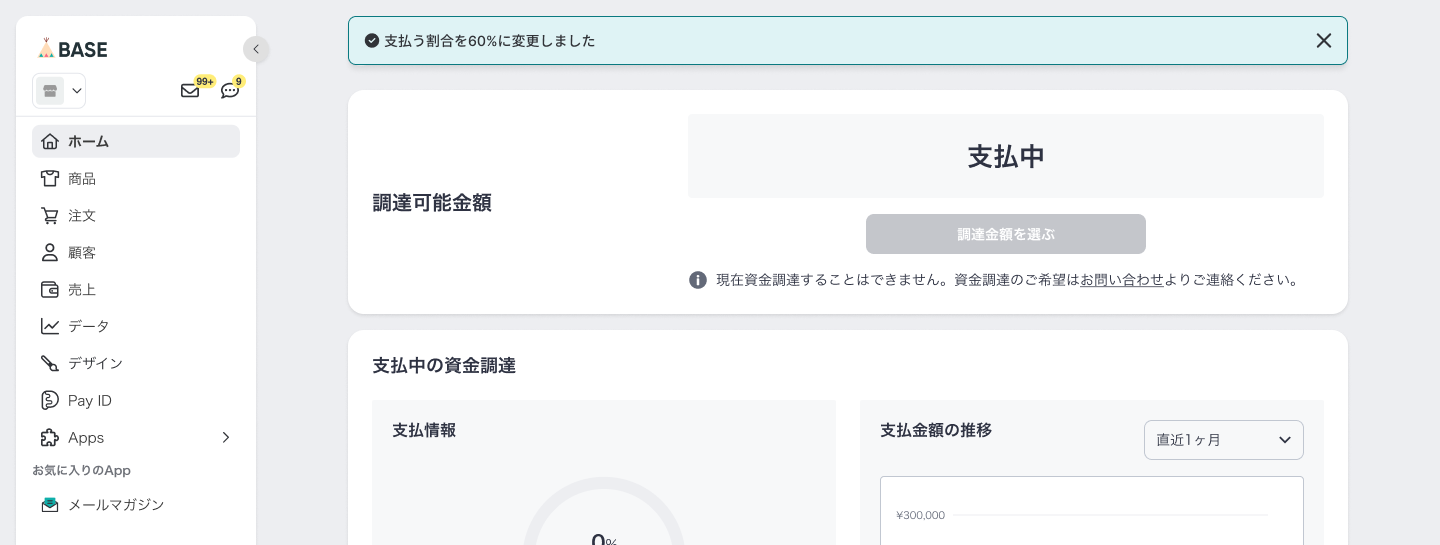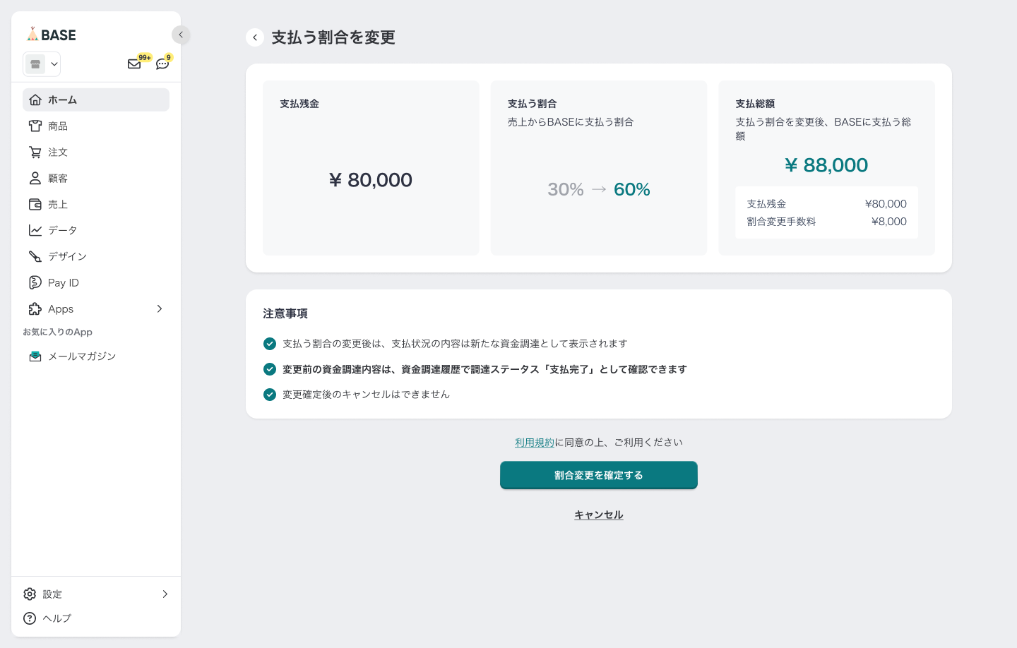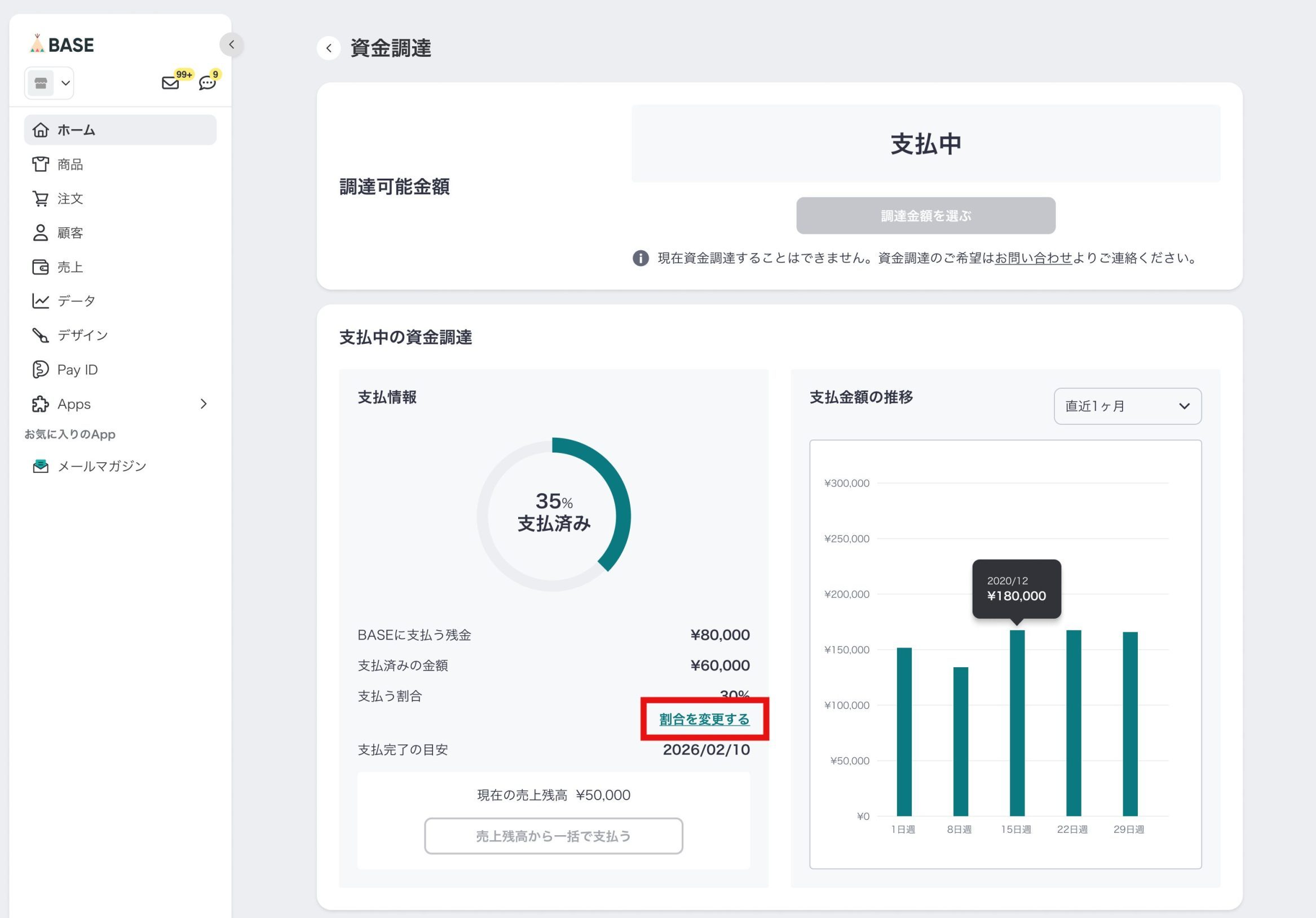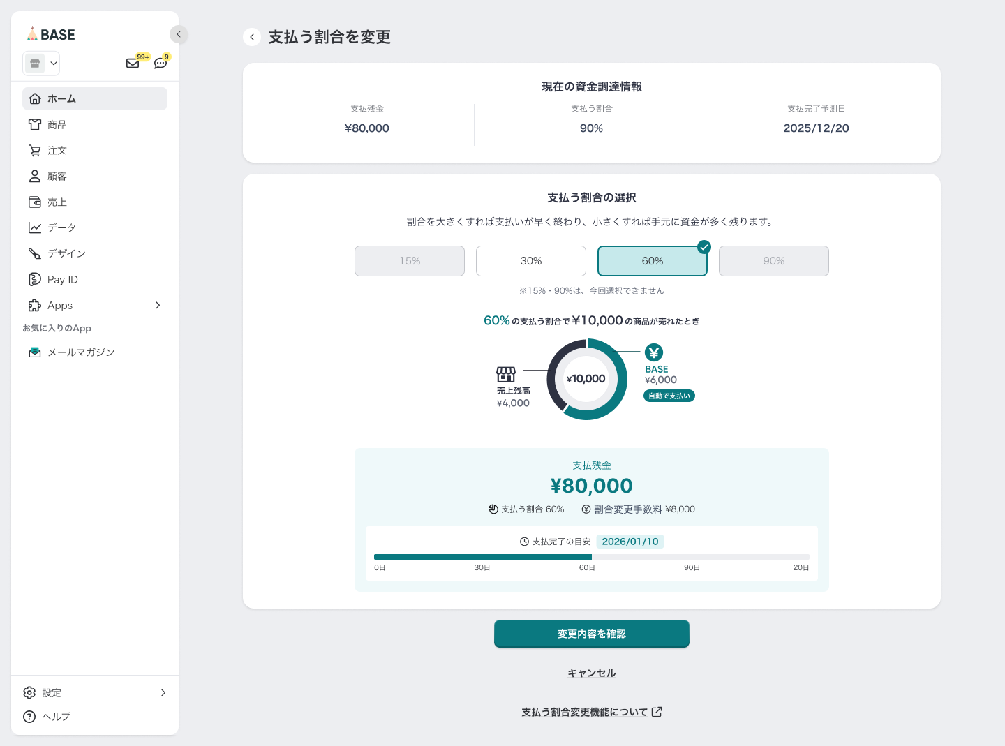 「今月の売上に合わせて、支払うペースを変えたい」というショップオーナーからのお声にお応えして、2025年12月4日(木)に、「支払う割合を変更できる機能」をリリースいたしました。