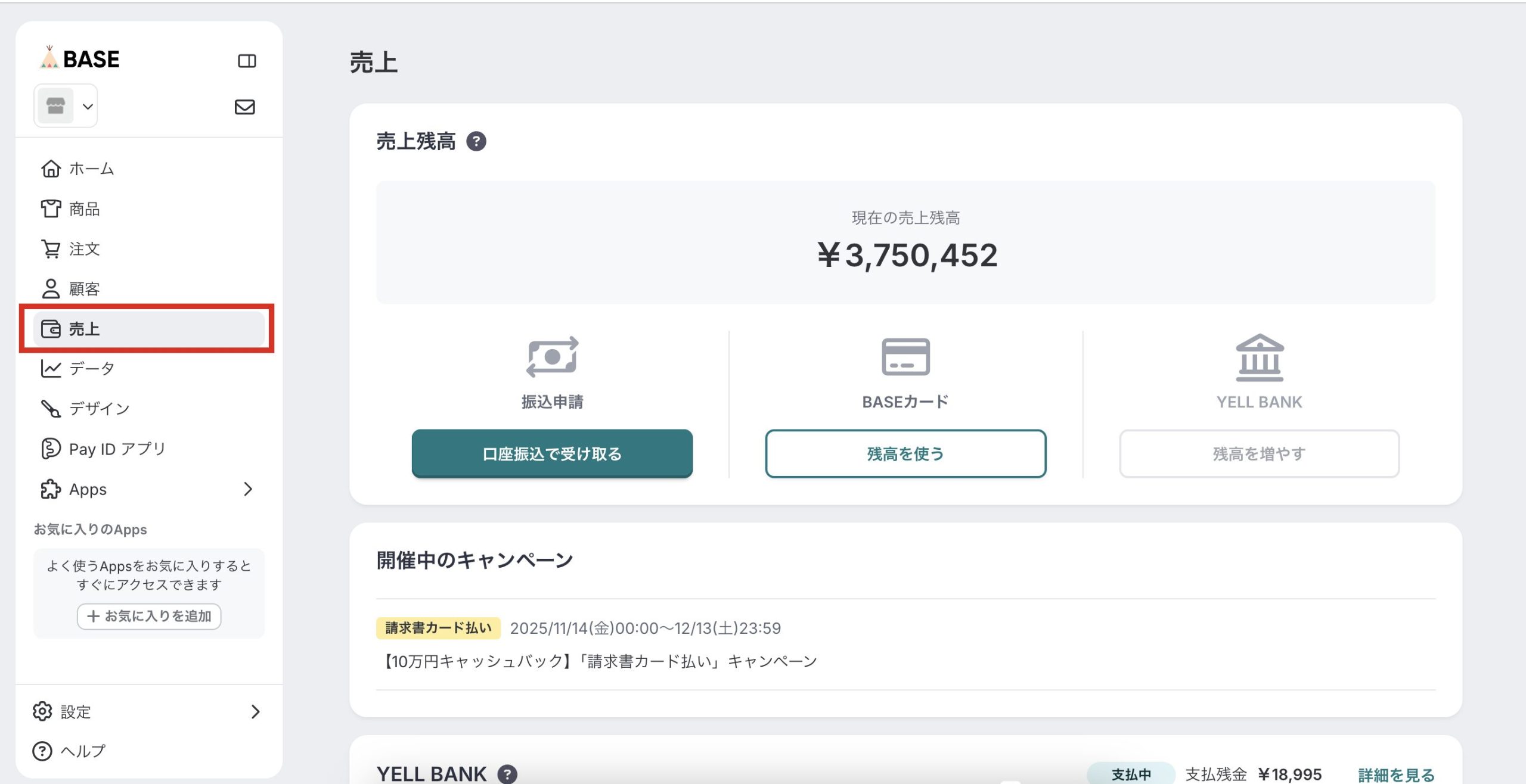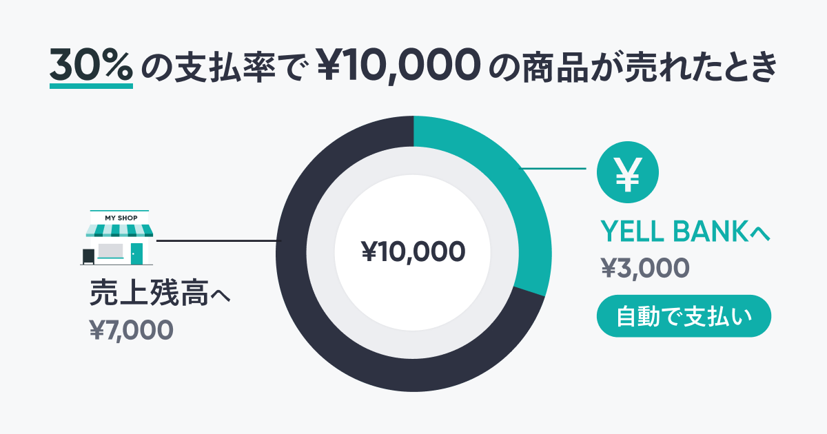 たとえば、「BASEに支払う割合(支払率)」30%を選択した場合、10,000円の商品が売れると、3,000円が「YELL BANK」に支払われ、残りの7,000円が売上として残ります。