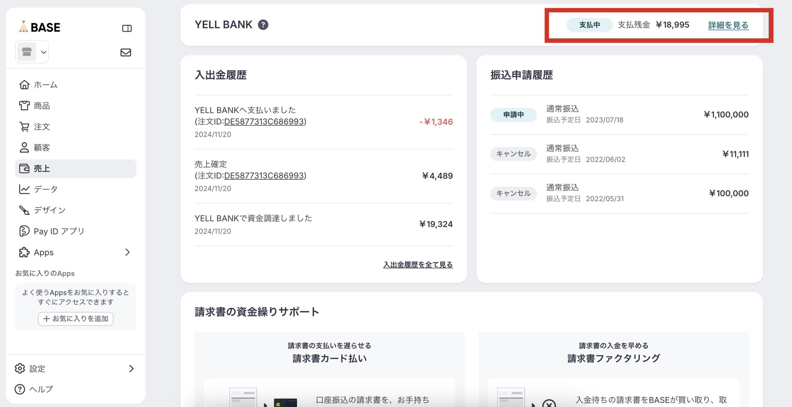 2. 「YELL BANK」エリアに表示されている、支払い中の調達の[詳細を見る]をクリックします
