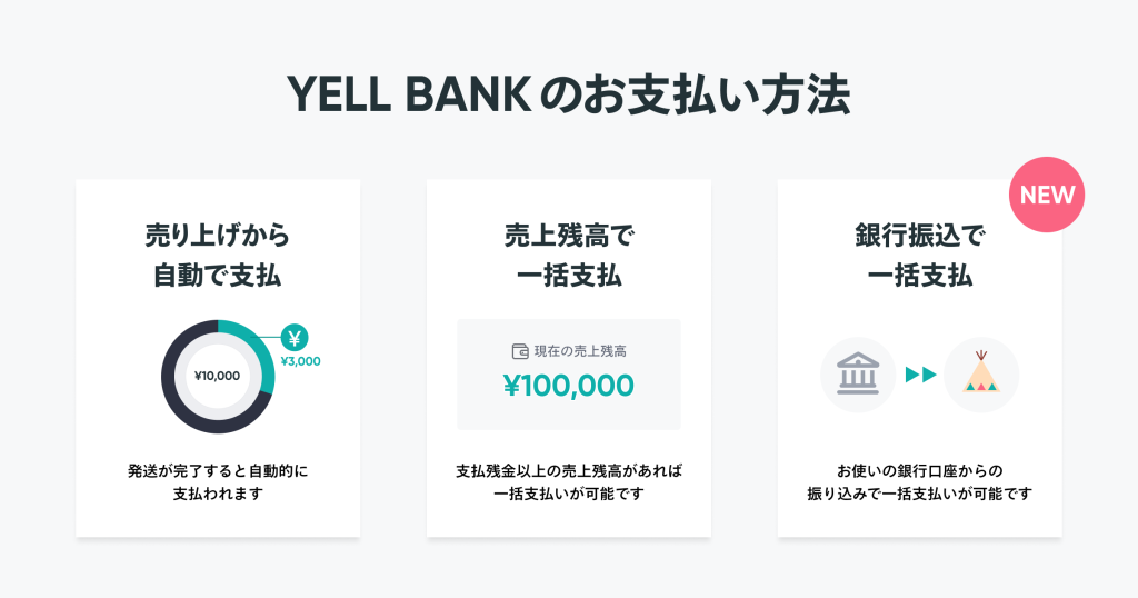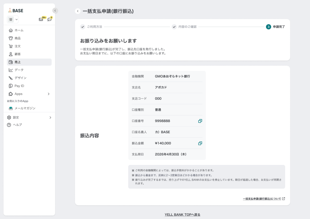 これにより、BASEの売上残高からの支払いだけでなく、ご自身の銀行口座からの振込によって、任意のタイミングで「YELL BANK」の支払いを完了することができます。