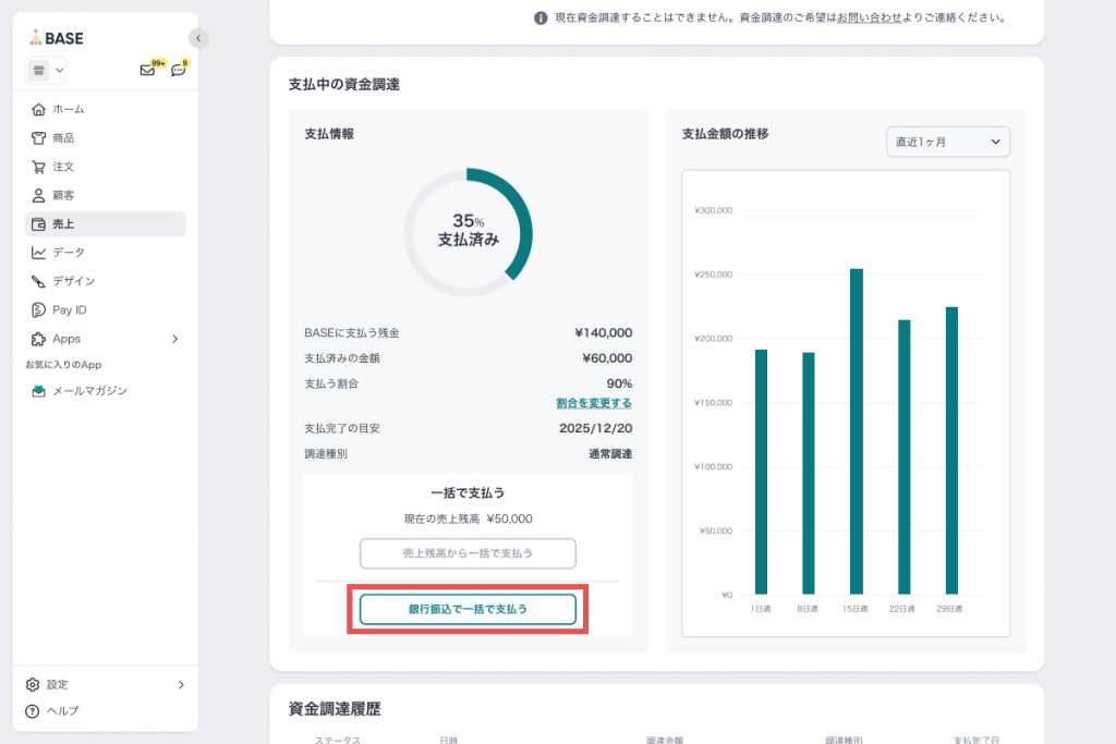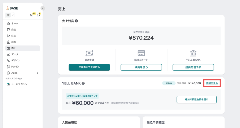 1. BASEの管理画面から「売上」画面を開き、「YELL BANK」エリアに表示されている、支払い中の調達の「詳細を見る」をクリックします