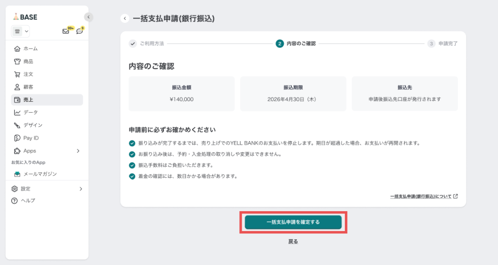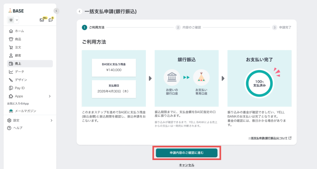 - 振込支払の申請中は、BASEの売上残高からの支払いは一時停止されます。